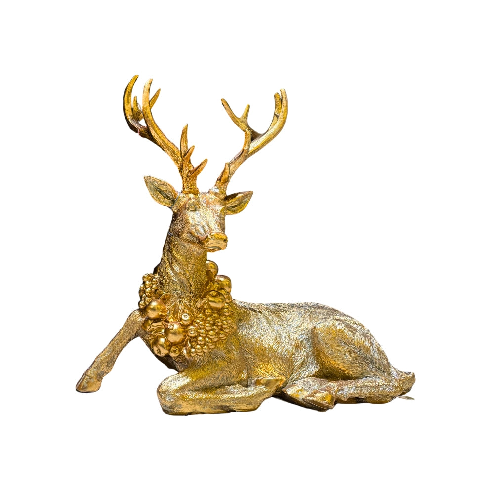 Agrega un toque de distinción y calidez navideña con este elegante ciervo dorado en posición de descanso. Perfecto para complementar una decoración de alto impacto con estilo y simbolismo. ¡Transforma tu hogar en una escena mágica de Navidad!