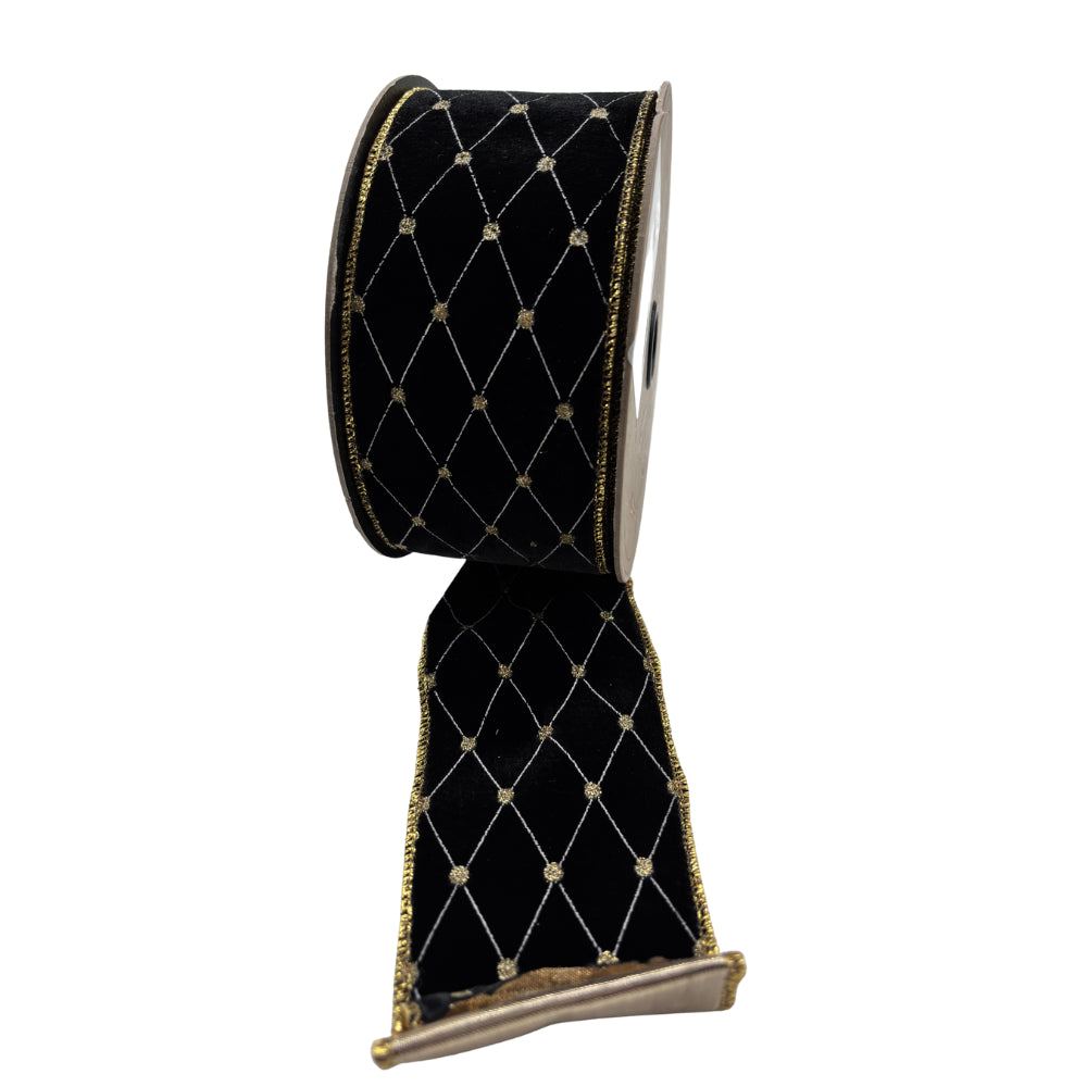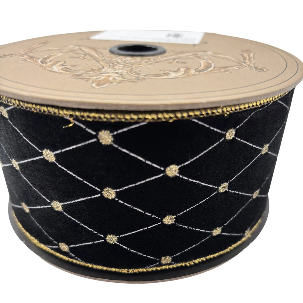 El contraste del negro profundo con líneas doradas crea un listón de presencia majestuosa y sofisticada. Su patrón de rombos bordados aporta textura y brillo sutil, ideal para decoraciones elegantes que buscan equilibrio entre lujo y modernidad. Perfecto para árboles, moños o centros de mesa con temática glam.