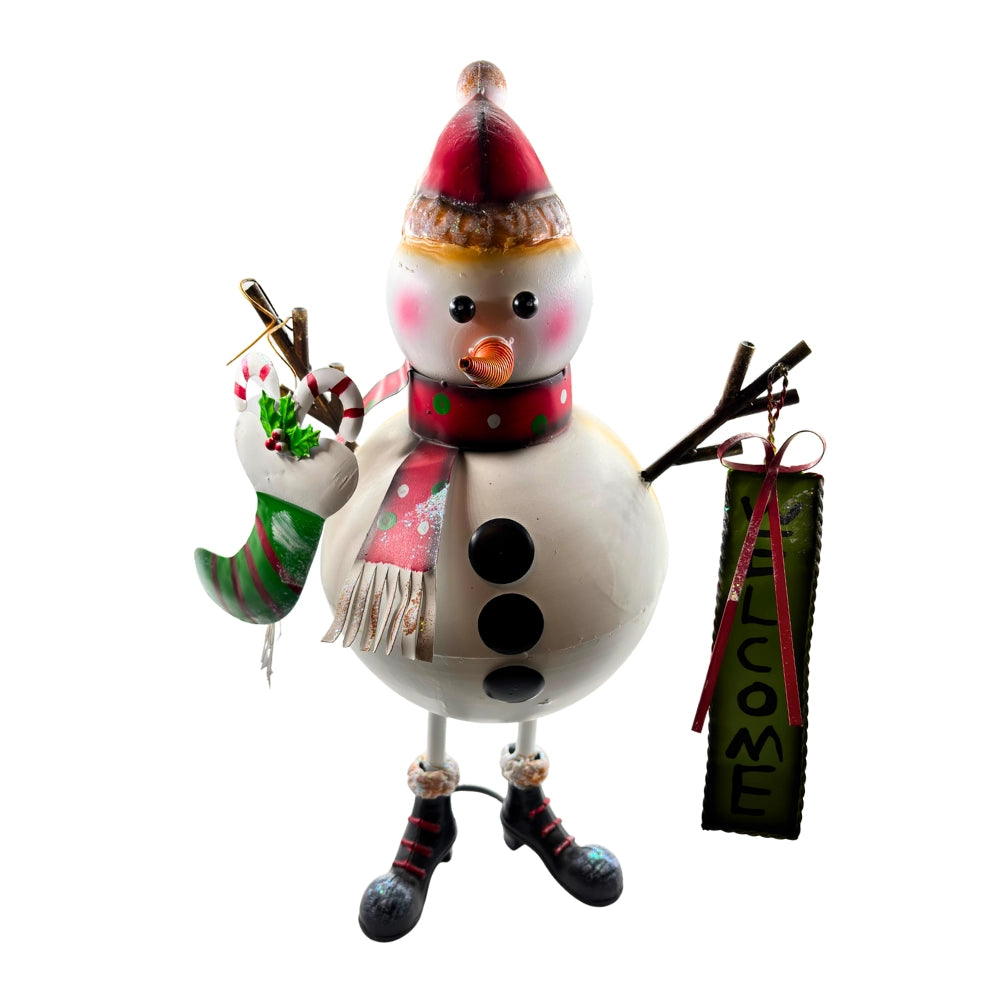 Recibe a tus invitados con alegría y ternura con este encantador muñeco de nieve metálico. Con detalles coloridos como su bufanda, letrero de "Welcome" y una bota navideña en la mano, este personaje irradia espíritu festivo y calidez. Ideal para decorar entradas, salas o vitrinas, aporta un toque divertido y acogedor a cualquier rincón navideño.