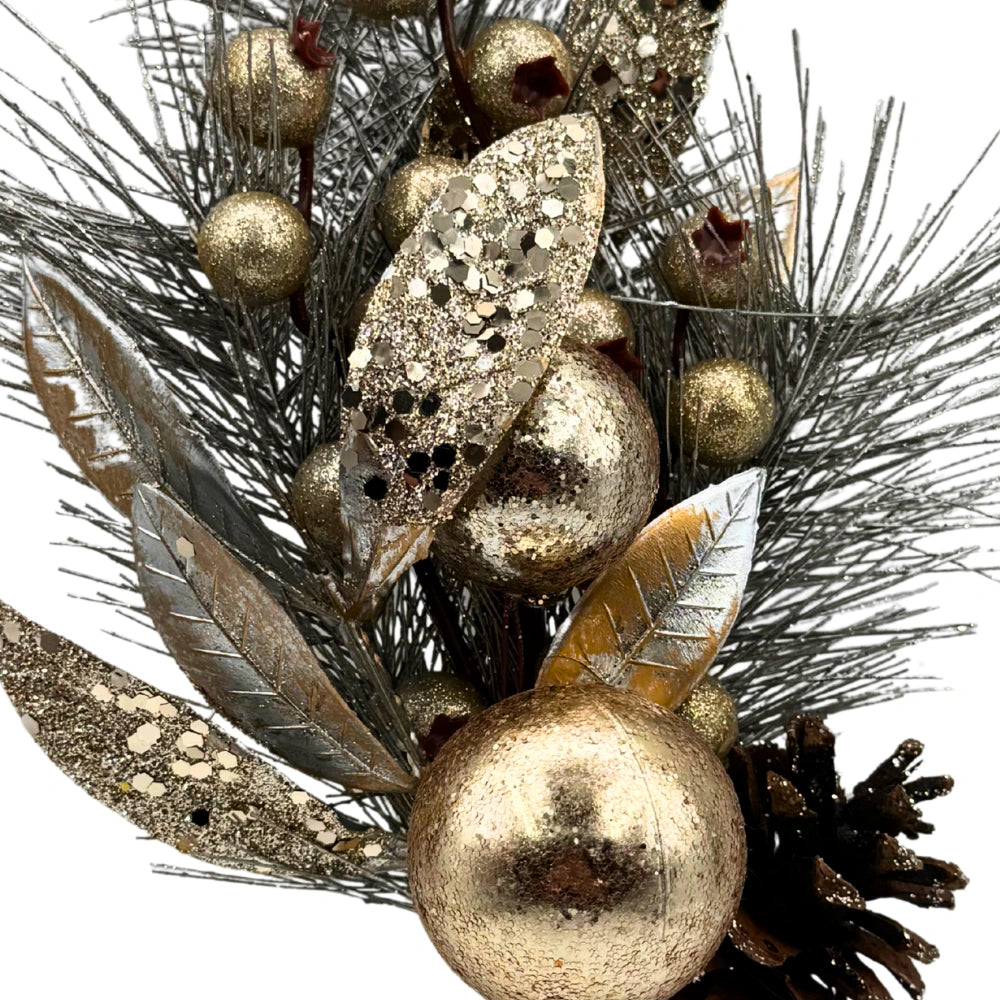 Este pick es el detalle ideal para transformar cualquier espacio en un rincón navideño lleno de elegancia. Con un estilo sofisticado en tonos dorados y plateados, este arreglo transmite la calidez y el brillo de las celebraciones más especiales. Perfecto para quienes buscan una decoración clásica, refinada y con un toque de glamour.