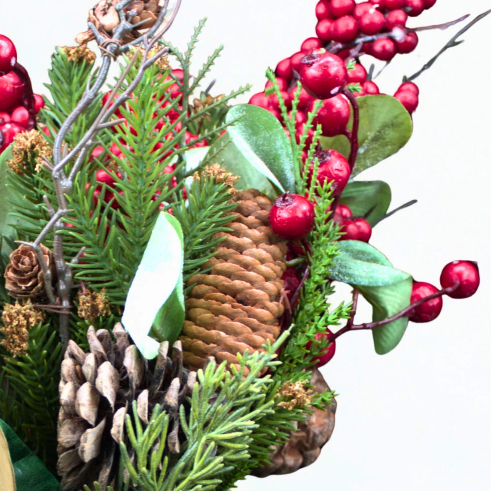 Materiales: Ramas artificiales de PVC, piñas naturales y bayas sintéticas