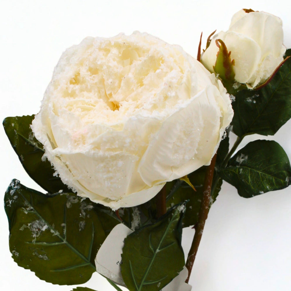 Decora tus espacios con la elegancia invernal de esta peonía blanca cubierta de nieve artificial. Su realismo aporta frescura y sofisticación a cualquier arreglo floral o decoración navideña. Haz que tu hogar brille con un detalle único y atemporal.